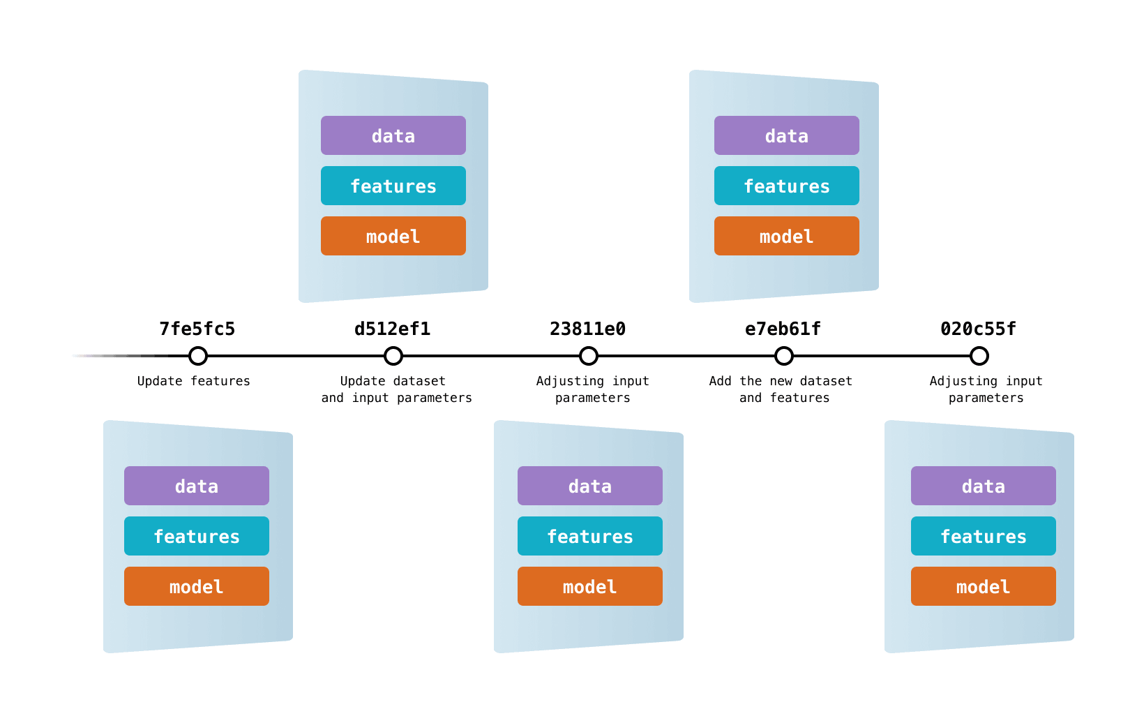 DVC enables data versioning through codification. You produce simple metafiles once, describing what datasets, ML artifacts, etc. to track. This metadata can be put in Git in lieu of large files. Now you can use DVC to create snapshots of the data, restore previous versions, reproduce experiments, record evolving metrics, and more!