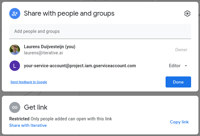 Share the Google Drive folders that you want to use with the service account. Navigate to your Google Drive folder's sharing options and add the service account as an editor (read/write) or viewer (read-only):